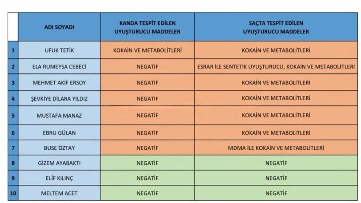 Soruşturma kapsamındaki en son gelişme ATK’dan gelen rapor oldu. Mehmet Akif Ersoy ile daha önce gözaltına alınıp serbest bırakılan Ela Rümeysa Cebeci‘nin verdiği “kan” ve “saç” örneklerinin test sonucu belli oldu. Daha önce hiç uyuşturucu kullanmadım diyen Ersoy’un saçından alınan örnekte kokain bulguları tespit edilmişti.