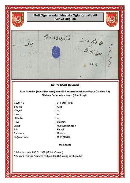 Milli Savunma Bakanlığınca bu kapsamda arşiv taramasında, Rize Askerlik Şubesi Başkanlığına ait “8355” numaralı, “askerde kayıp olanlara” ait silahaltı defterinin 213’üncü sayfasında, Erdoğan’ın dedesinin, “Rize ili Ulucami köyünden ‘Mutioğullarından’ lakaplı Mustafa oğlu 1882 doğumlu Kemal, askerde meçhul 30.01.1337 (Mühür-Osman)” şeklinde yazılı olduğu aktarılıyor.