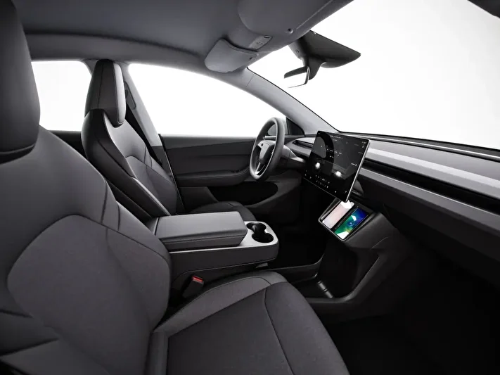 Tesla, Model Y Standard’ın kabininde de “minimalizm” felsefesini öne çıkarmış durumda. Bu versiyonda HEPA filtre yer almıyor, döşemelerde ise kumaş ve vegan deri kombinasyonu tercih edilmiş. Aynalar ve koltuklar manuel ayarlı, ön camlarda lamine cam kullanılmadığı için ses yalıtımı daha zayıf.