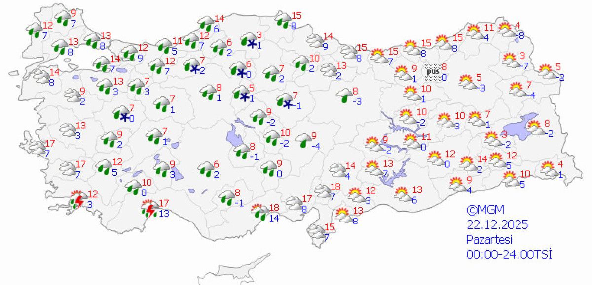 Sıcaklıklar belirgin düşüş göstererek, iç kesimlerde 5-10 dereceye, doğuda ise 0-5 dereceye geriliyor.